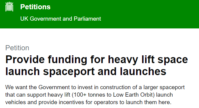 A few months ago now, I started a petition that asks the UK government to fund a heavy lift spaceport for rockets above 100 tonnes to LEO. It is already UK space policy to provide such launch sites for foreign companies - notably Virgin Orbit - but that case failed because the company was not financially sound. My suggestion is simply to apply the same principle for a much better launch vehicle from a company that is on a more stable footing. As well as serving existing launch markets, I believe that such a location could be used to support a large scale UK space station.