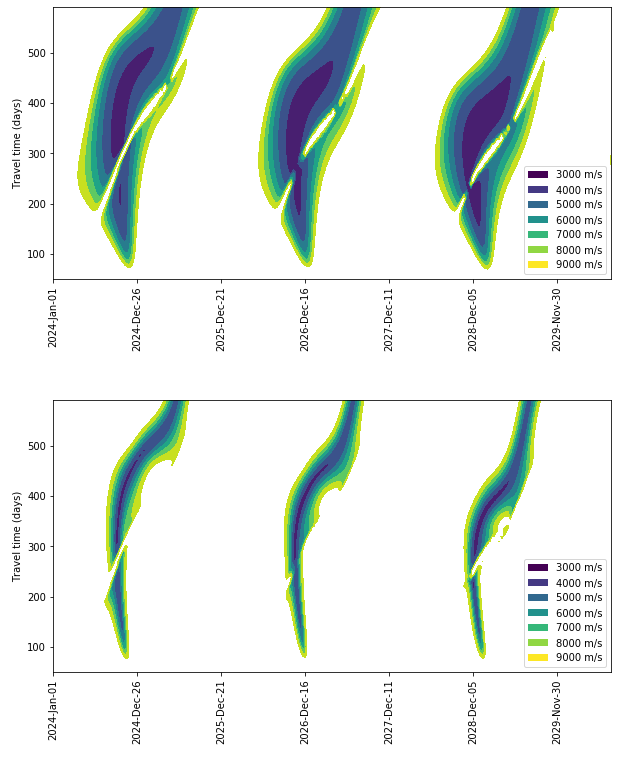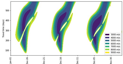 This is all fairly standard stuff - but the dusk-dawn orbit has another feature not as commonly understood: it’s viable for interplanetary travel. The plot below demonstrates how.