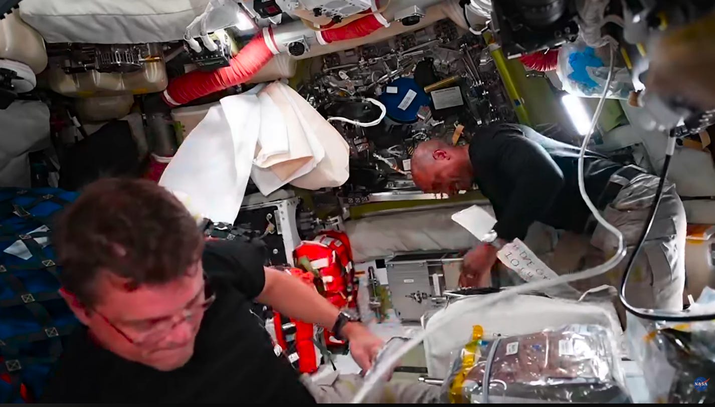 The crew spent today preparing the cabin for reentry. Originally, one of the main activities was to have been a full test of radiation shelter procedure; this was mostly skipped for time, with a reduced demonstration being performed instead to ensure that the shelter area could be properly ventilated with all four crew members inside.