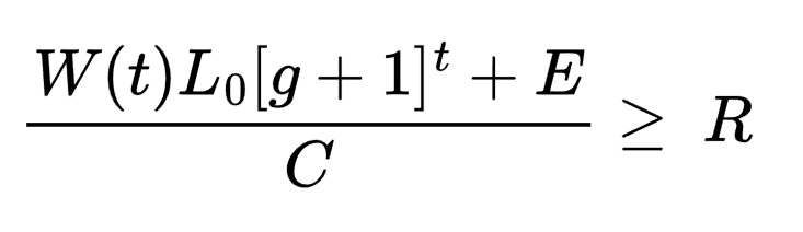 W(t) is the wealth of the next colonist at time t. L0 is the initial mass leverage, g the growth rate with respect to time, E the exports value (set to zero in the above example), C the launch cost and R the annual requirements of each person. Note that here I have reverted to using time instead of income decile; that was a simplification to avoid complicating the plots.