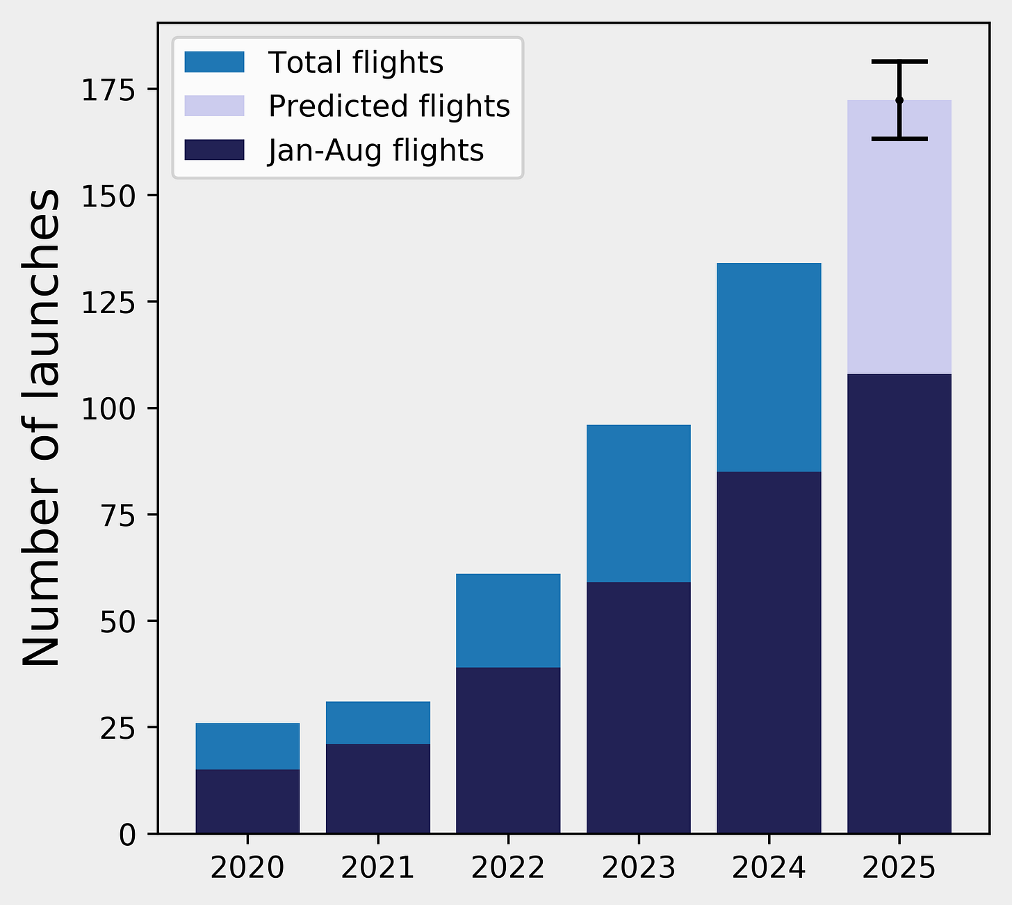 The prediction is now for 172 flights this year, with a range from 163 and 181. This is pretty stable at this point month-to-month. This would represent a 28% increase on the last year - smaller than the 40% increase from 2023 to 2024. The slowdown that began with the anomalies of mid-2024 seems to be a long term trend. This is to be expected, as there are no natural permanent exponentials, only S curves with flatten out. At a certain point Falcon cadence will max out, and at which point hopefully Starship and other vehicles will be ready to pick up the baton and maintain growth.