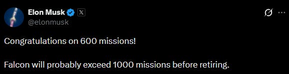 On January 17th, SpaceX celebrated its 600th Falcon 9 mission. The following day, Elon Musk posted the following: