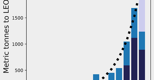 The recent rate of increase of Falcon flights, roughly 43%, is obviously not sustainable forever. True exponential processes don’t exist in nature, never mind business, and all of them must level off eventually. This is why I’ve been modelling the flight rate as an S curve for some time; if the current rate is to be maintained, as it has to be in order to reach Musk’s 2050 target for mass-to-orbit, then Starship will have to pick up the baton for this kind of growth.
