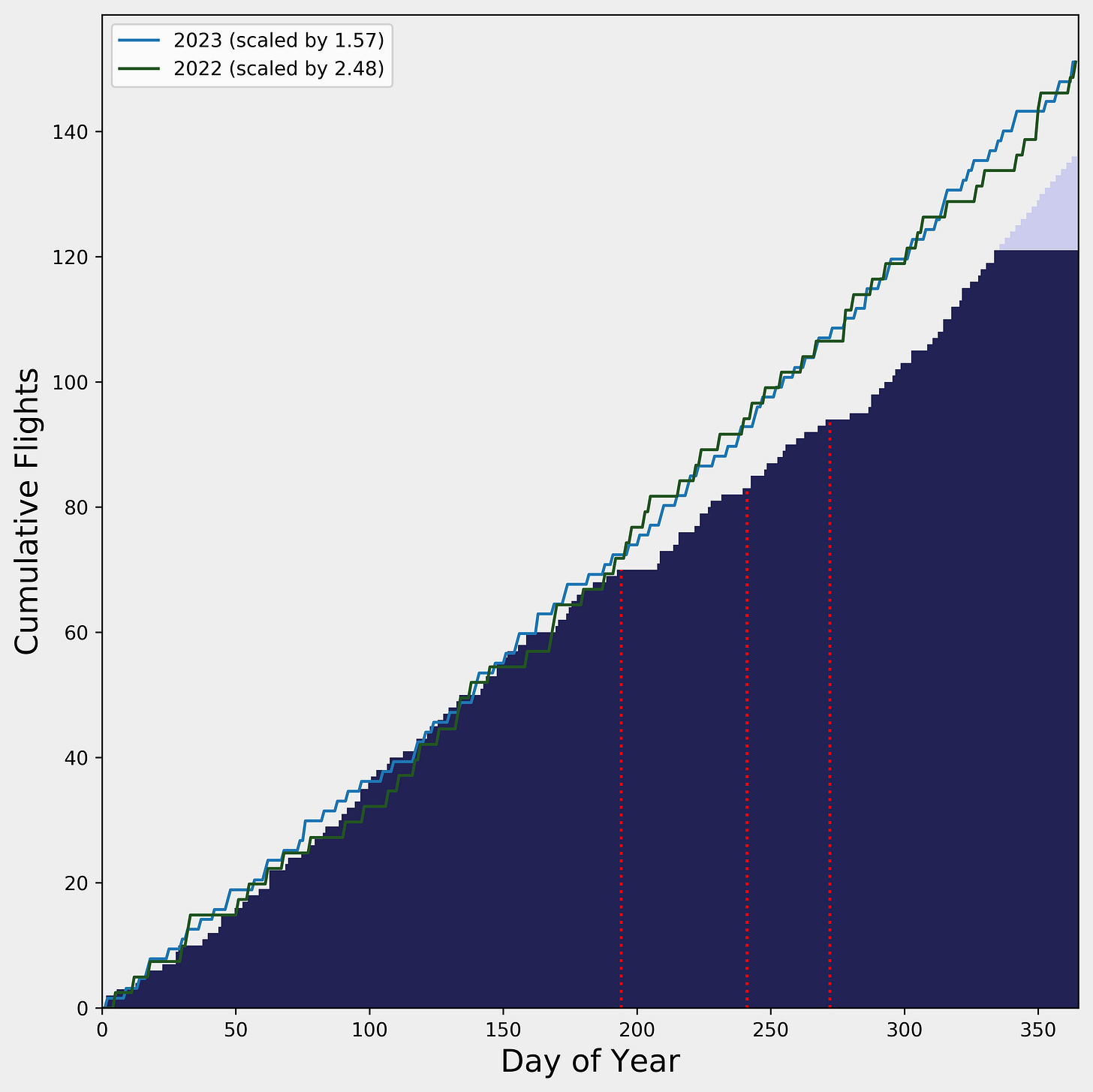 Last month I modeled the cumulative rate of Falcon 9 flights against scaled flight rates for the past two years, by 57% per year. These two years of increase have been unusually fast - and for a while it looked as if this new higher pace might continue in 2024.