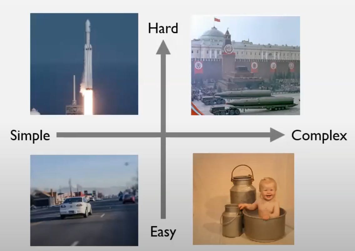Top left is spaceflight - as mentioned above, a hard problem but simple in that the objective is well defined. Top right is a centrally planned economy - suffering from both a huge amount of moving parts and a complex and poorly defined objective.
