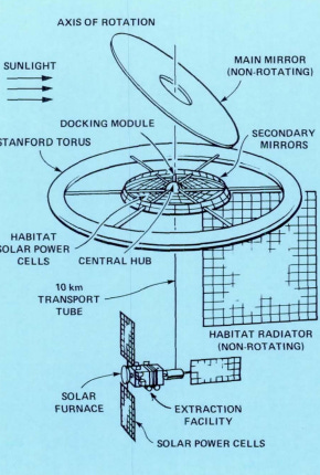 The habitat proposed was a large ring shaped structure that was to become known as the “Stanford Torus” as this study was conducted at Stanford University. This torus has a major radius of 900 metres and rotates at 1 RPM, to provide Earth gravity on the rim. It would be located at the Earth-Moon L5 points, and its axis of rotation would be orientated perpendicular to the direction to the Sun, and a mirror floating above it would reflect sunlight into secondary mirrors in the hub, into the roof of the torus. This is much lighter than the habitat and non-rotating so can be more easily kept aligned as the direction to the Sun changes over the year.